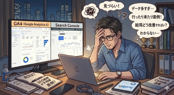 Webサイトを運営していると必ず直面する悩み。それは「GA4(Google Analytics 4)の画面が見づらい」「Search Console(サチコ)と行ったり来たりするのが面倒」「データを見ても、結局どう改善すればいいか分からない」ということ。